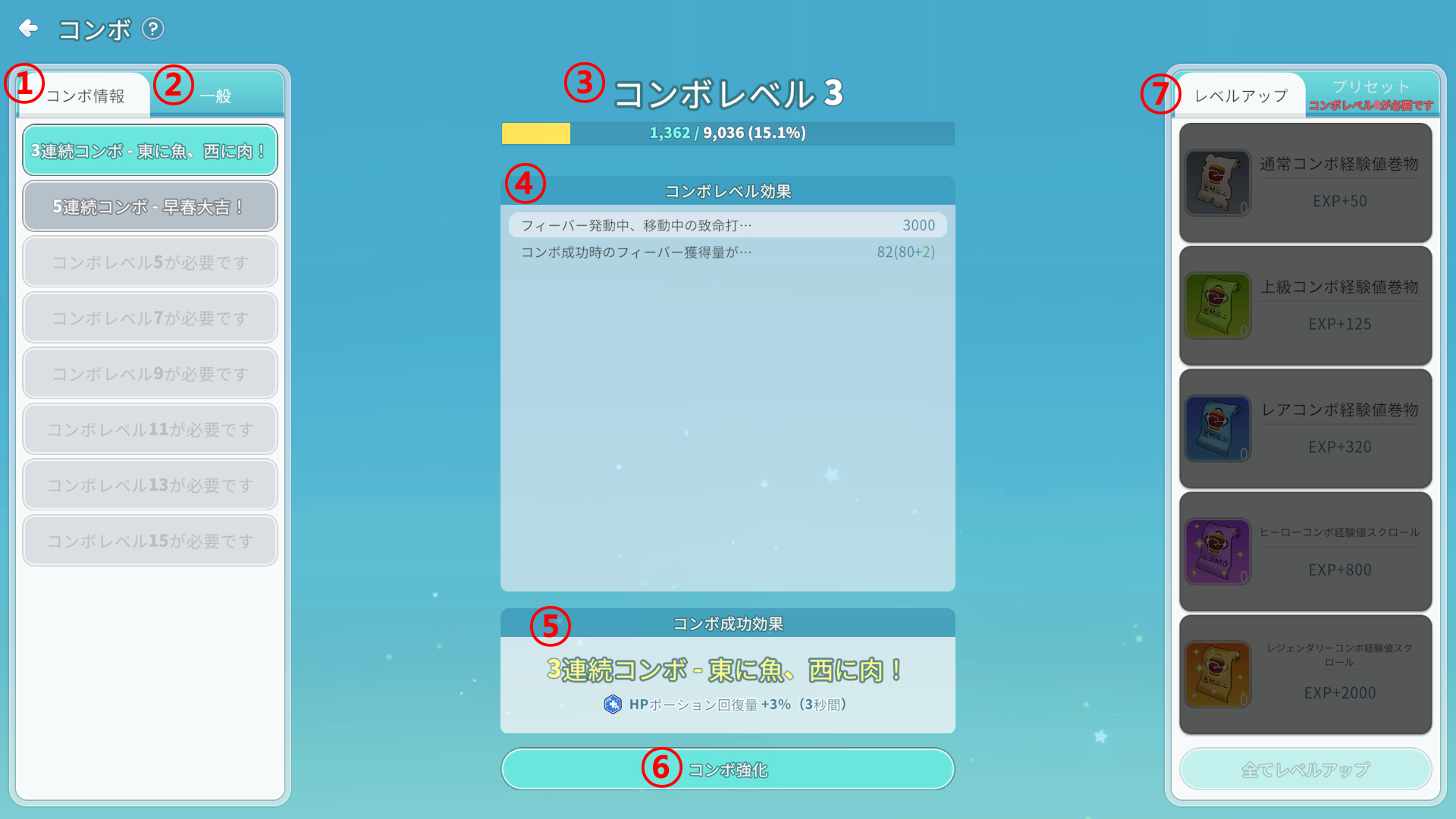 ①強化するコンボの名前と強化に必要なコンボ経験値スクロールの数を確認できます。