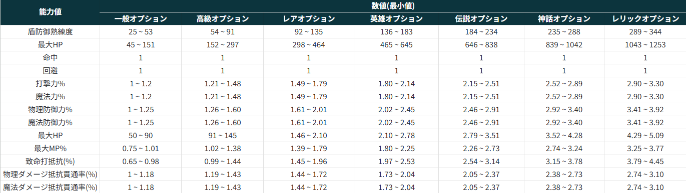 | アイコン | アイテム名 | 着用条件 | 数値 | 能力値 | 最小値 | 最大値 |