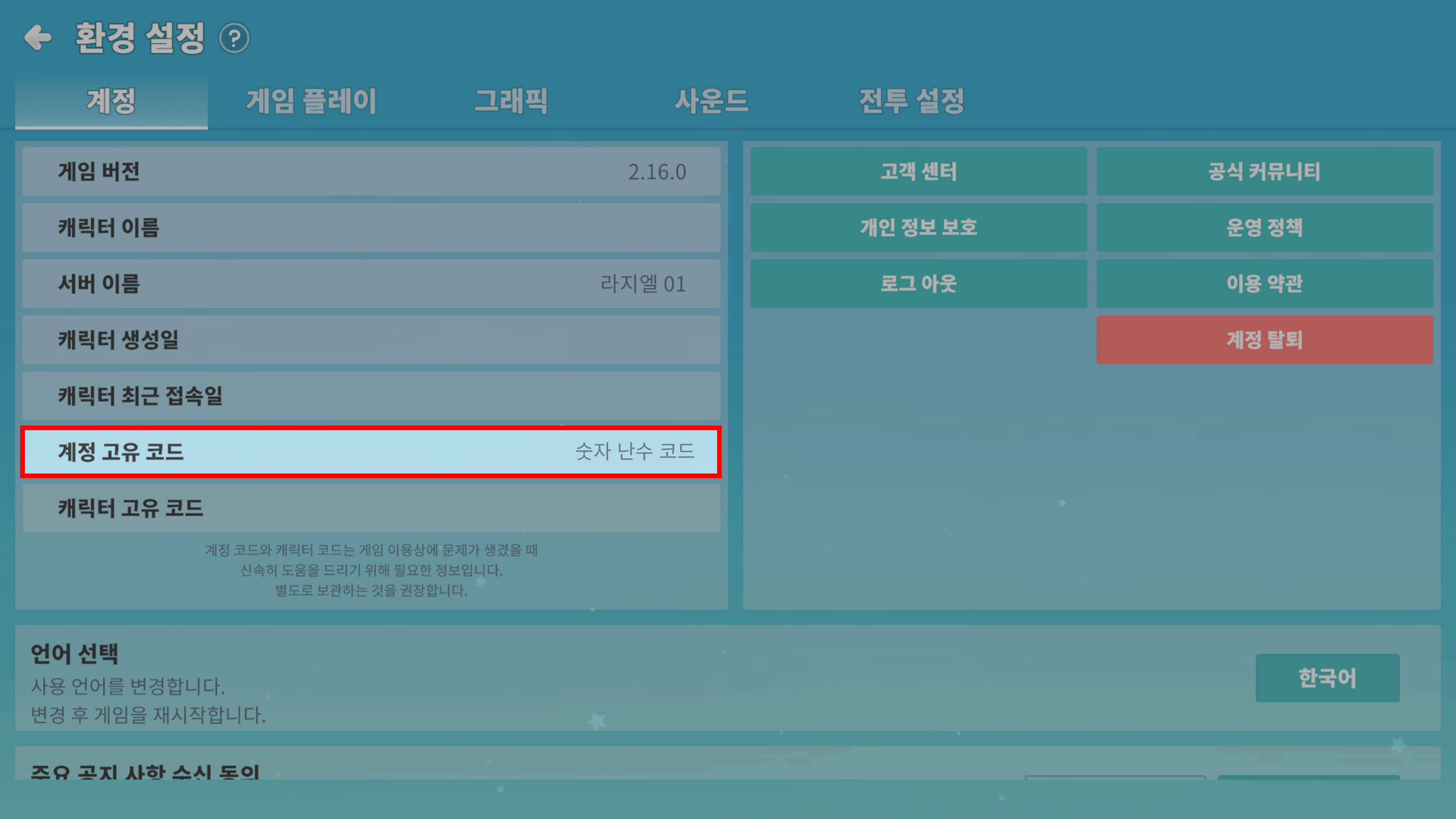 STEP 1. 계정 고유 코드를 확인합니다. (게임 내 환경 설정에서 확인 가능하며, 터치 시 자동 복사됩니다.)