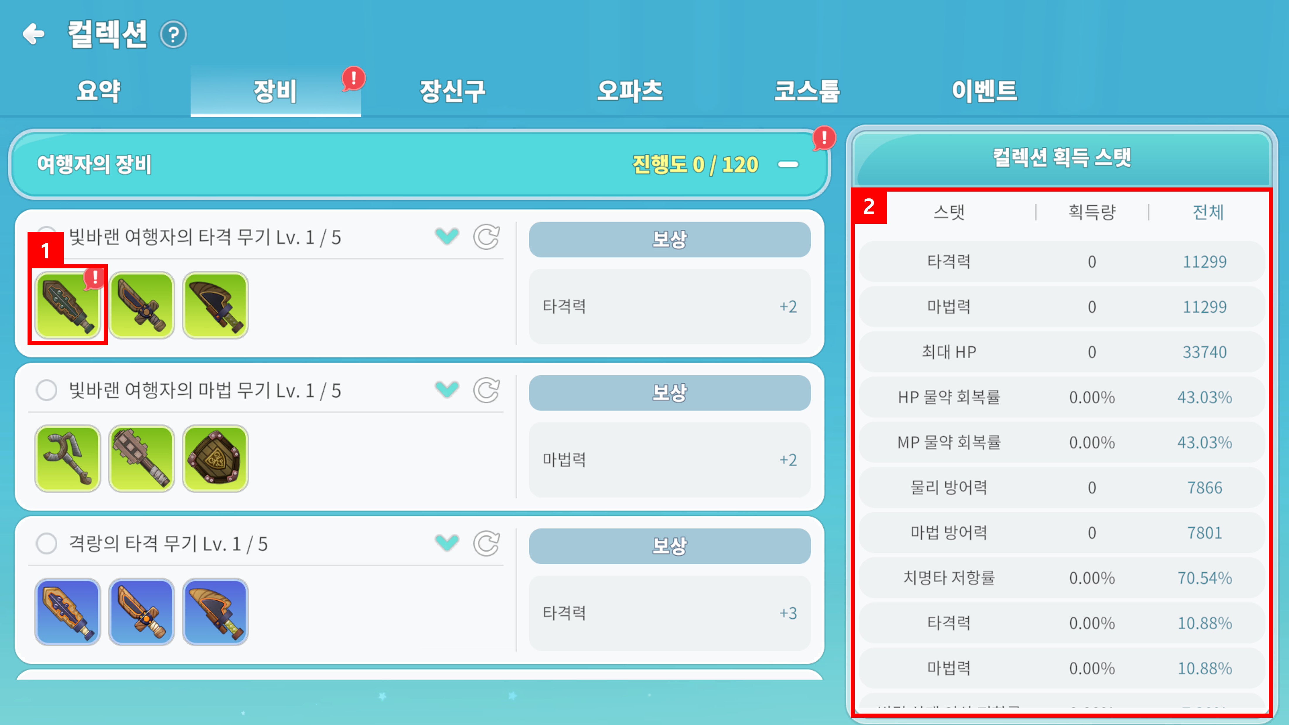 - 항목 별 수집을 완료할 때마다 그에 다른 보상을 획득할 수 있습니다.
