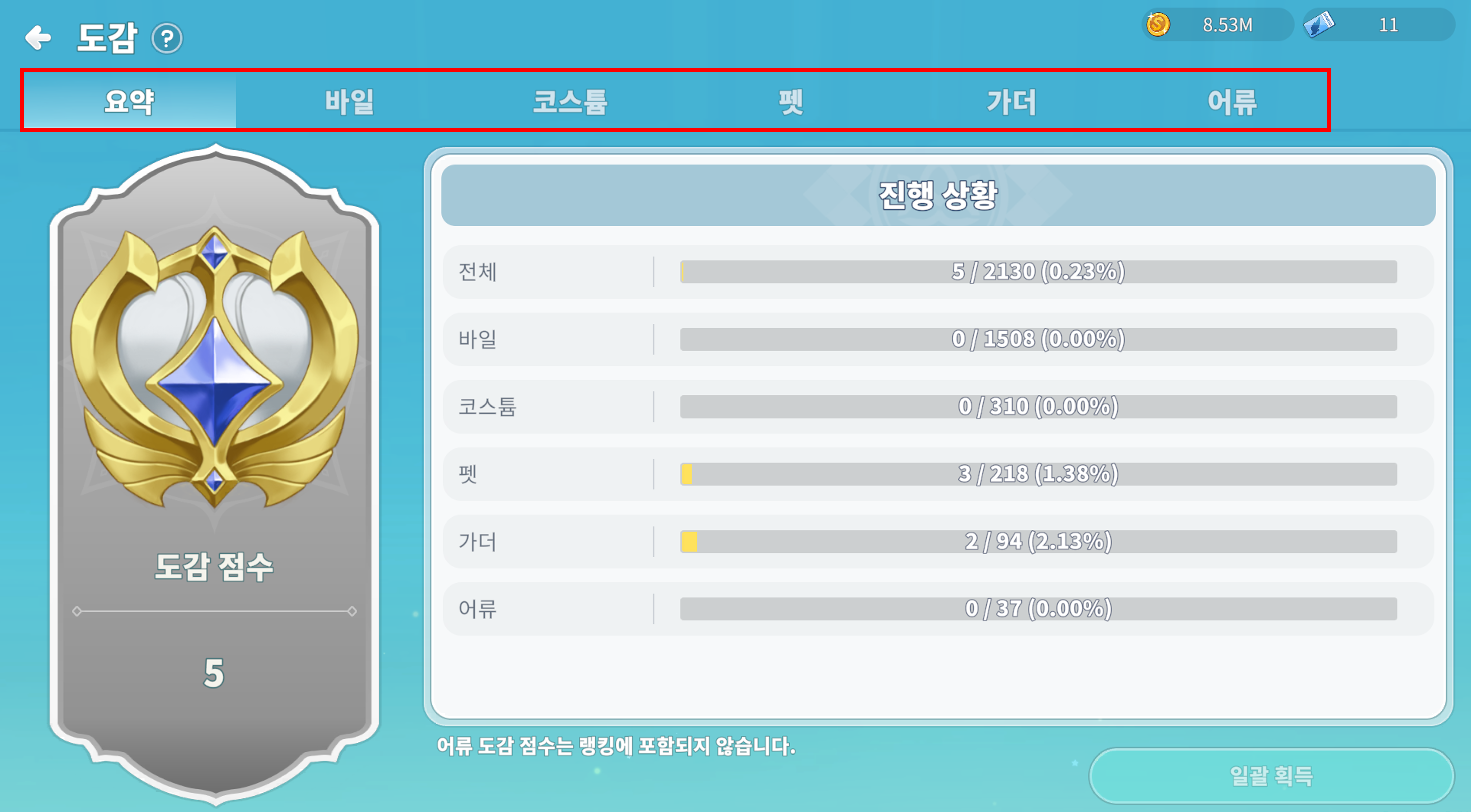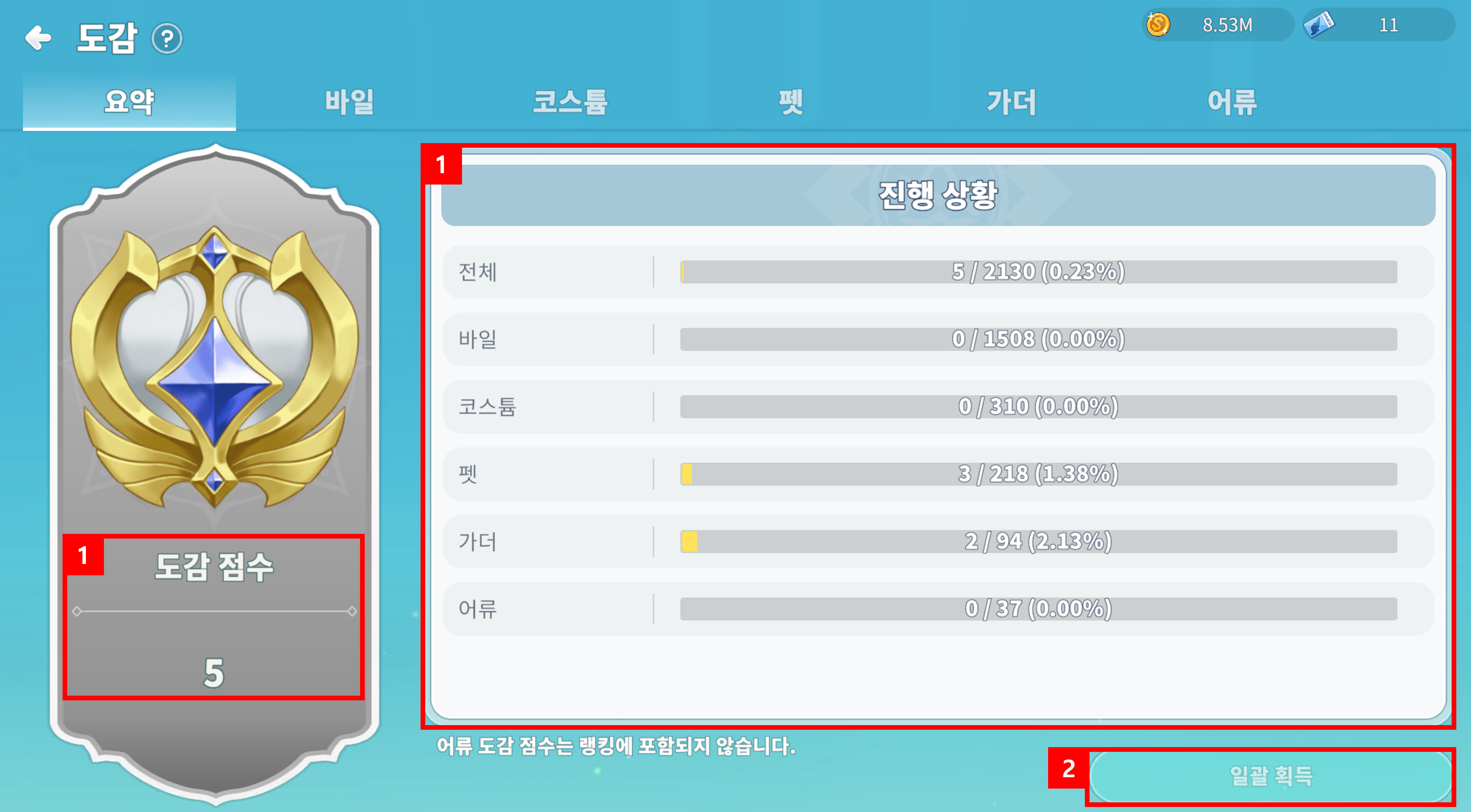 ① 도감 요약 메뉴에서 도감 점수와 진행 상황을 확인할 수 있습니다.