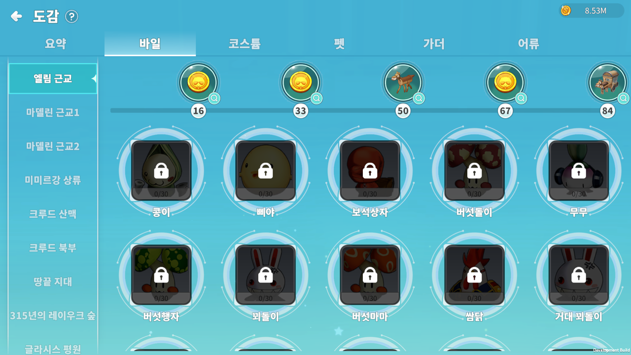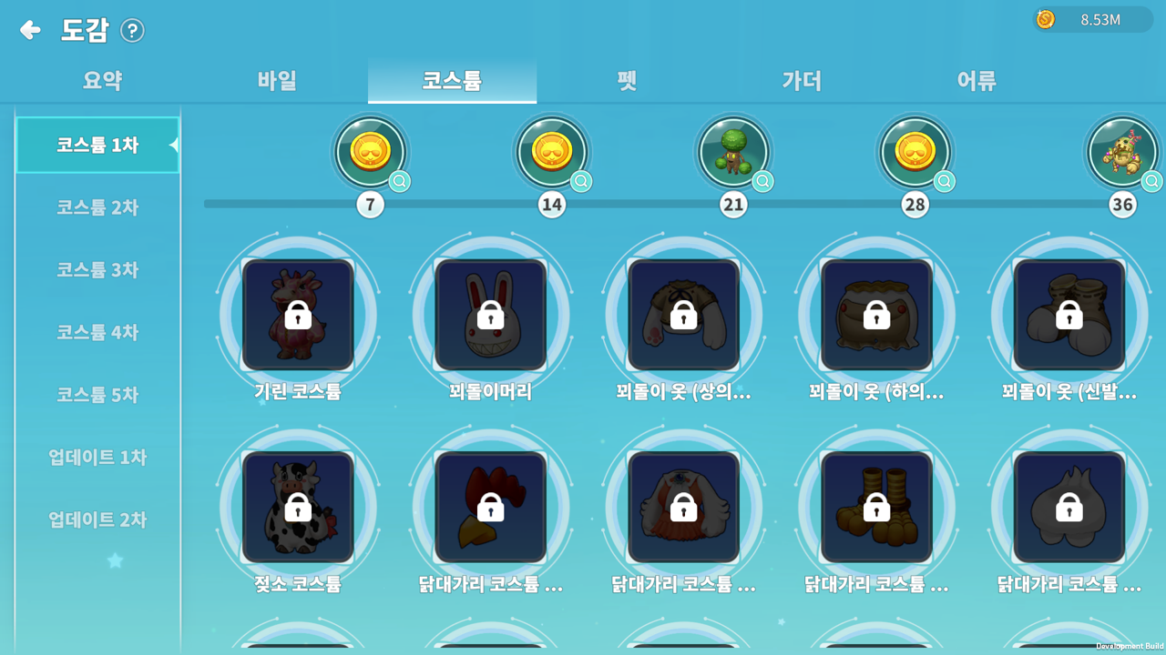 코스튬/펫/가더 도감 – 현재까지 획득한 아이템이 해금됩니다.