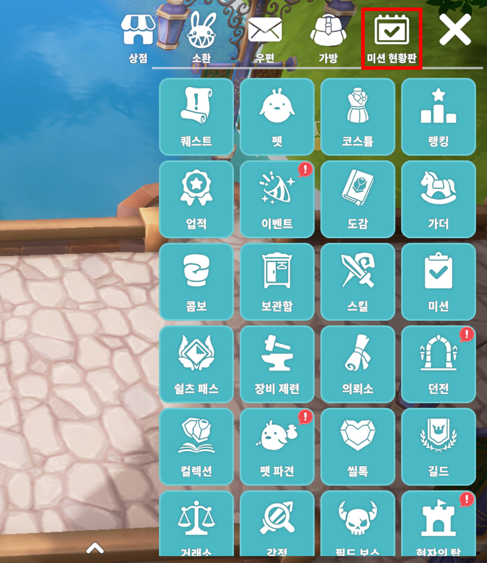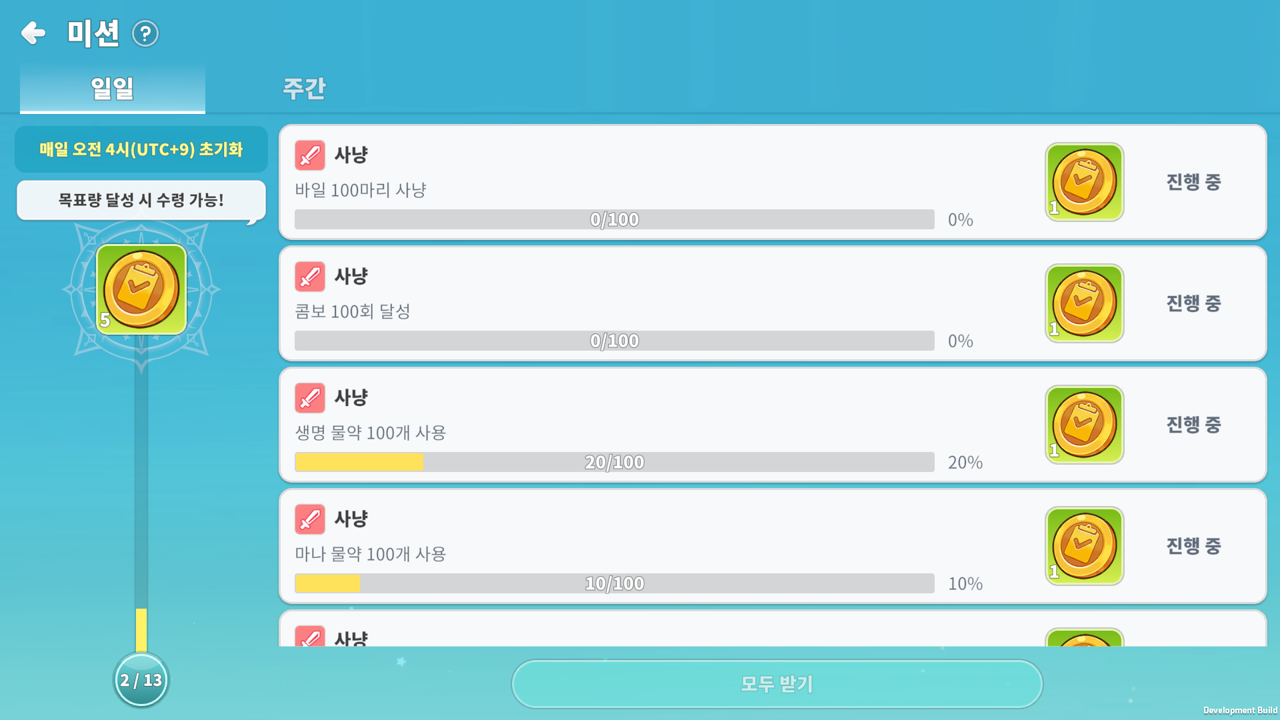 메인 화면 우측 상단의 미션 아이콘을 터치하여 완료한 미션 보상을 '모두 받기' 할 수 있습니다.