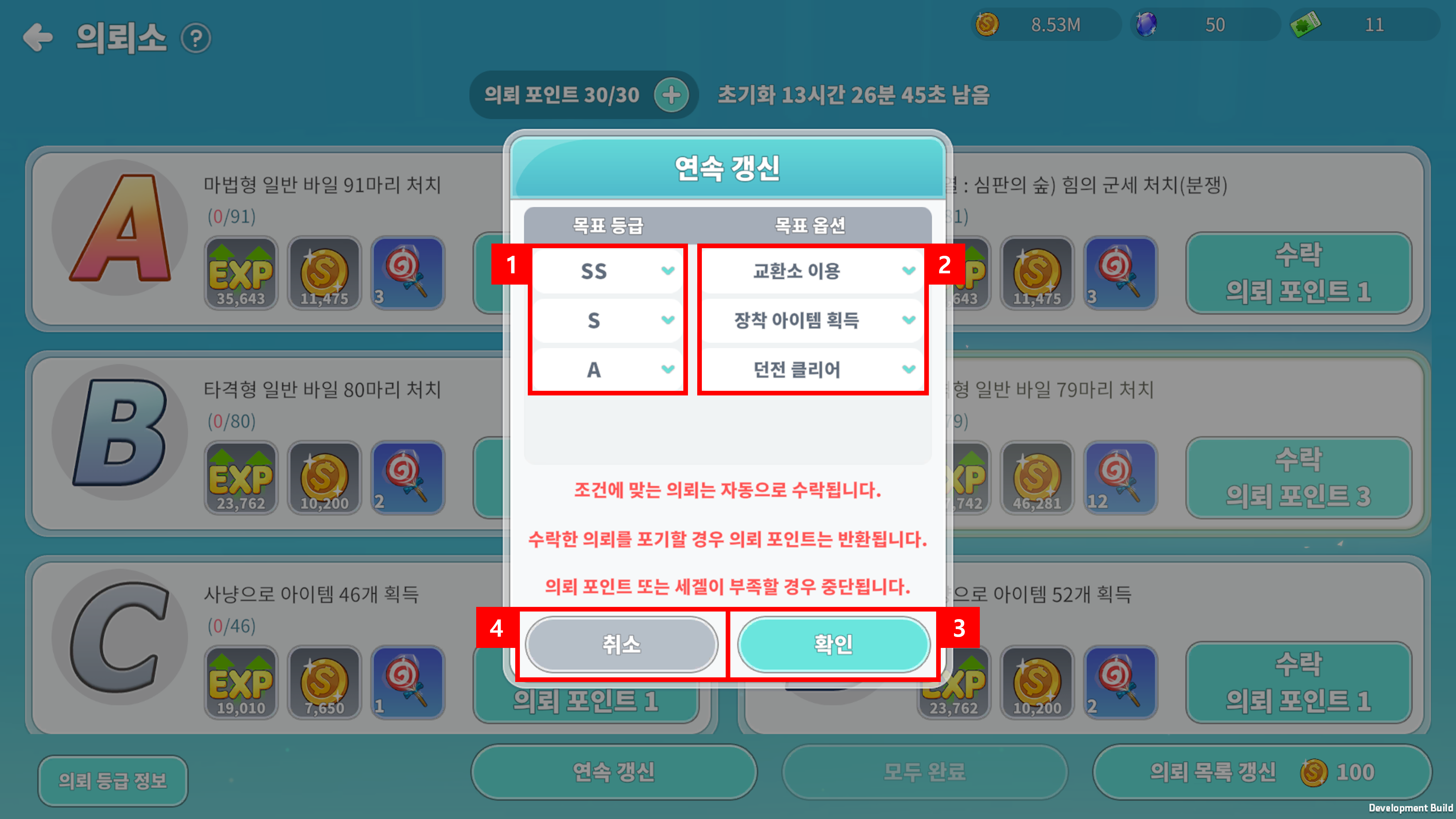 ② 버튼을 클릭하여 의뢰를 수락하거나 포기할 수 있으며, 의뢰 수락 시 의뢰 포인트는 의뢰 난이도 마다 다르게 소모됩니다.