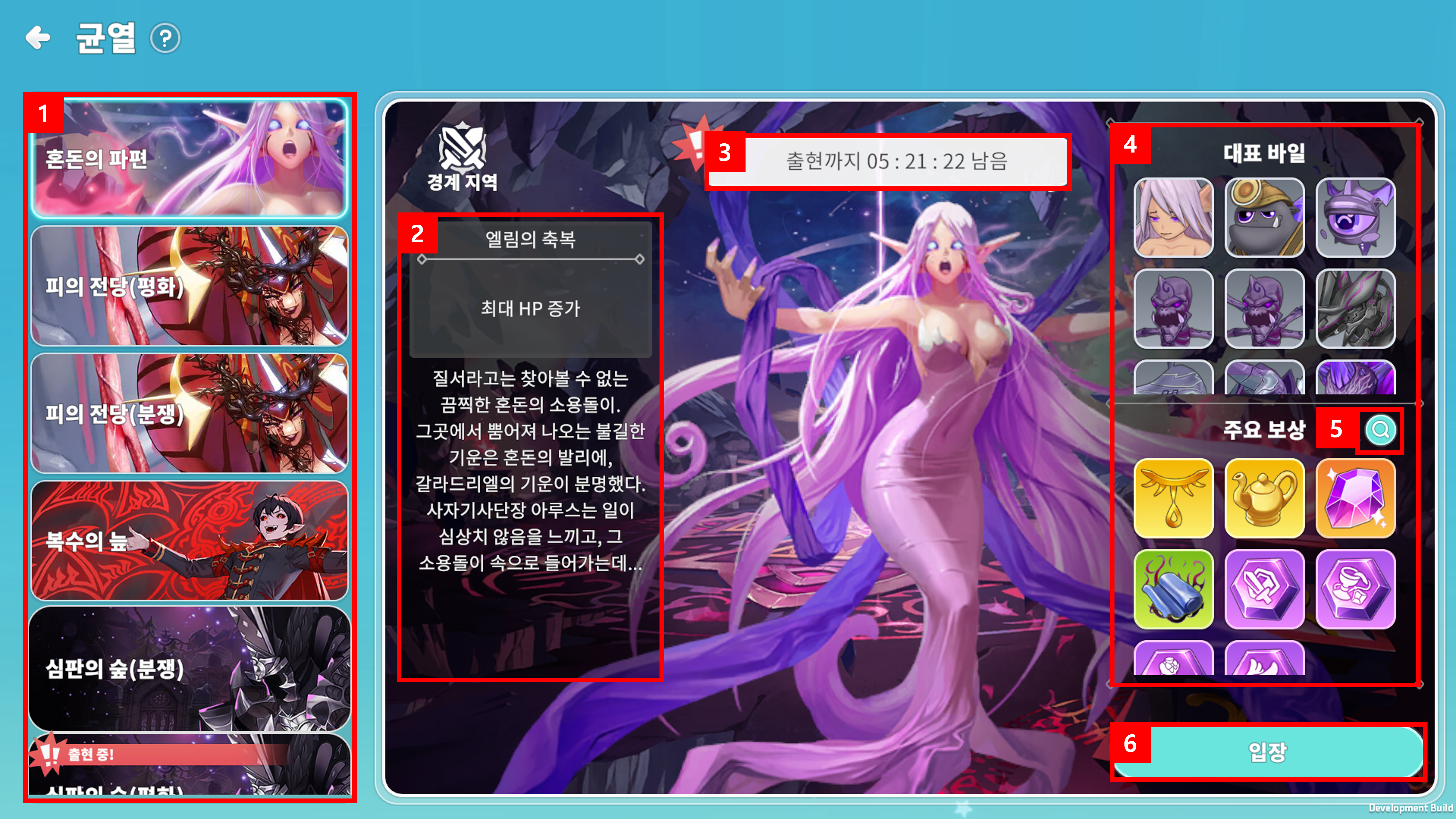 | 혼돈의 파편 | 피의 전당(평화) | 피의 전당(분쟁) | 복수의 늪 | 심판의 숲(평화/분쟁) |