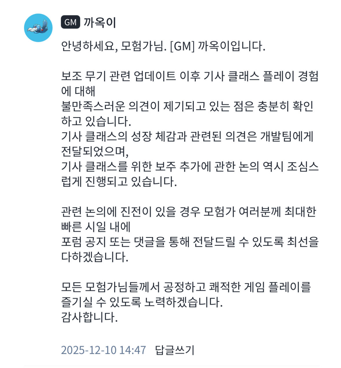 운영진 측은 분명히 기존 유저들의 권익을 보호하겠다고 말했습니다. 그런데 왜 기사 유저들의 권익은 보호하지 않는 것입니까?