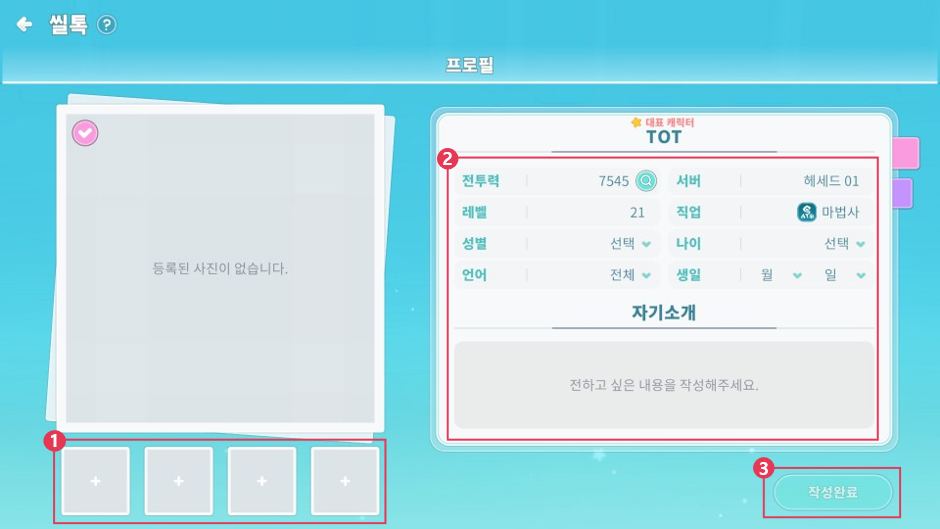 ② 성별, 나이 등 정보와 자기 소개를 입력합니다. 전투력, 서버, 레벨, 직업 정보는 대표 캐릭터의 정보가 자동으로 입력됩니다.