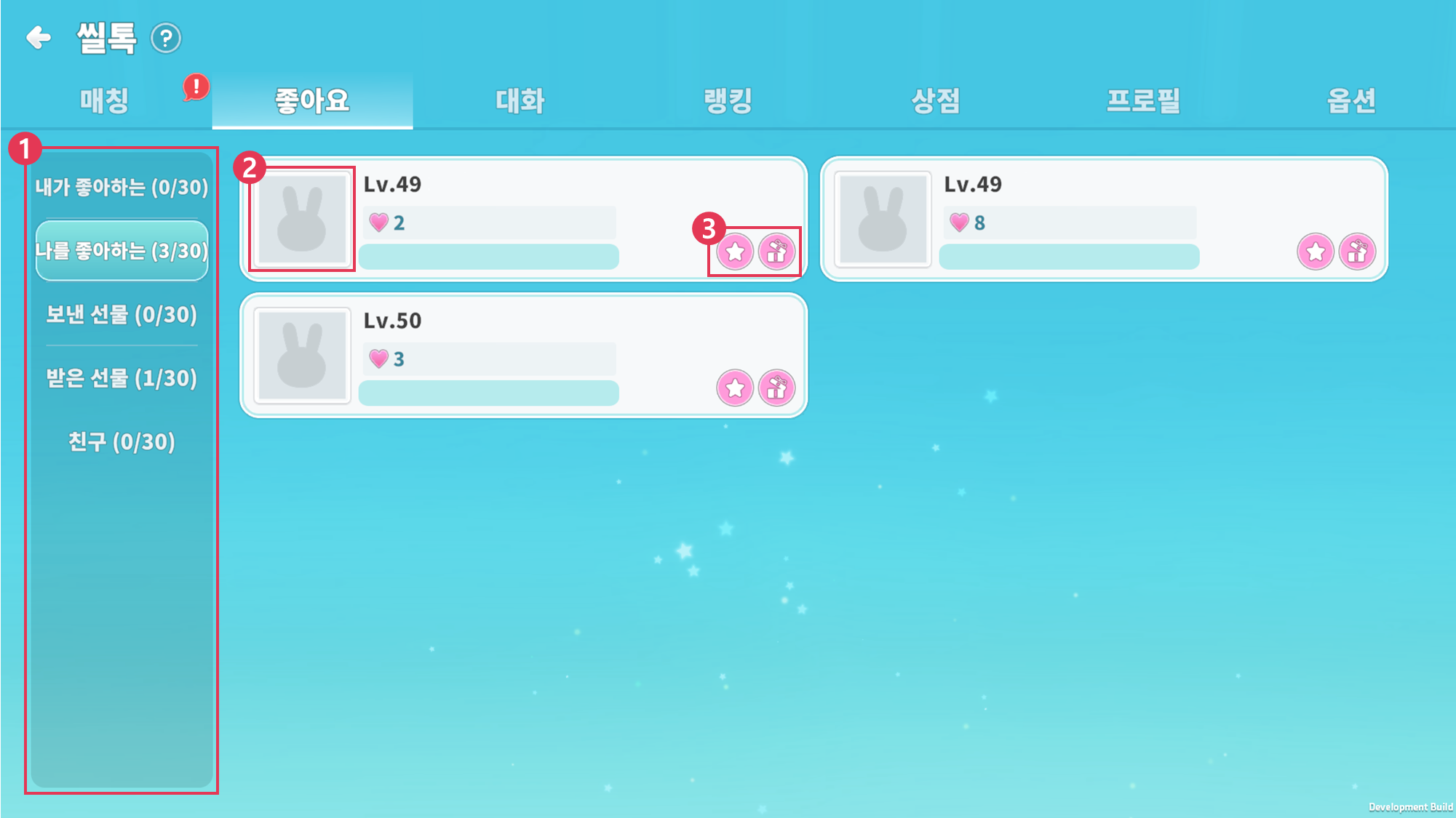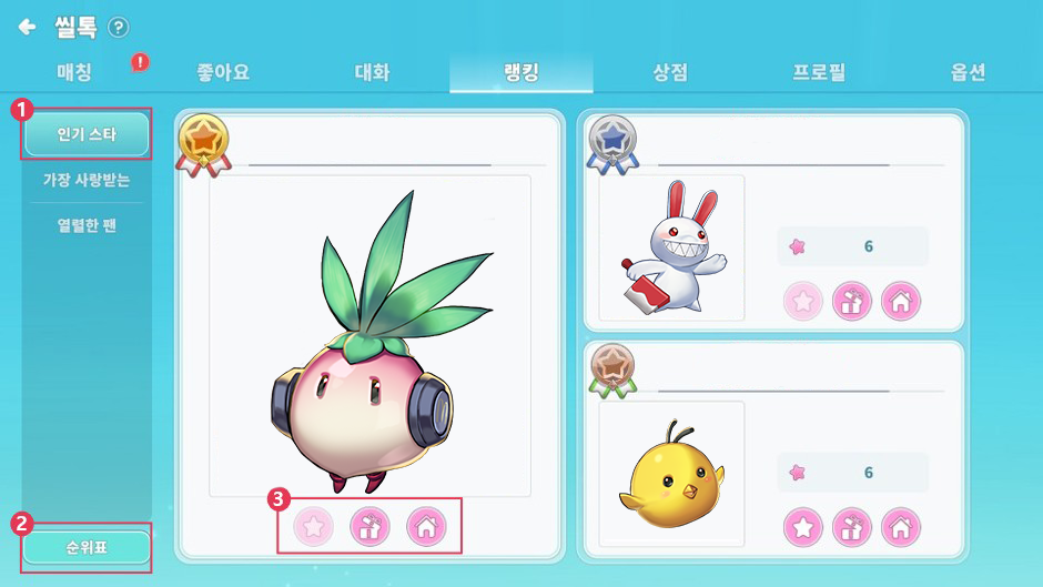 ③ 좋아요, 선물을 보내거나 프로필을 확인할 수 있습니다.