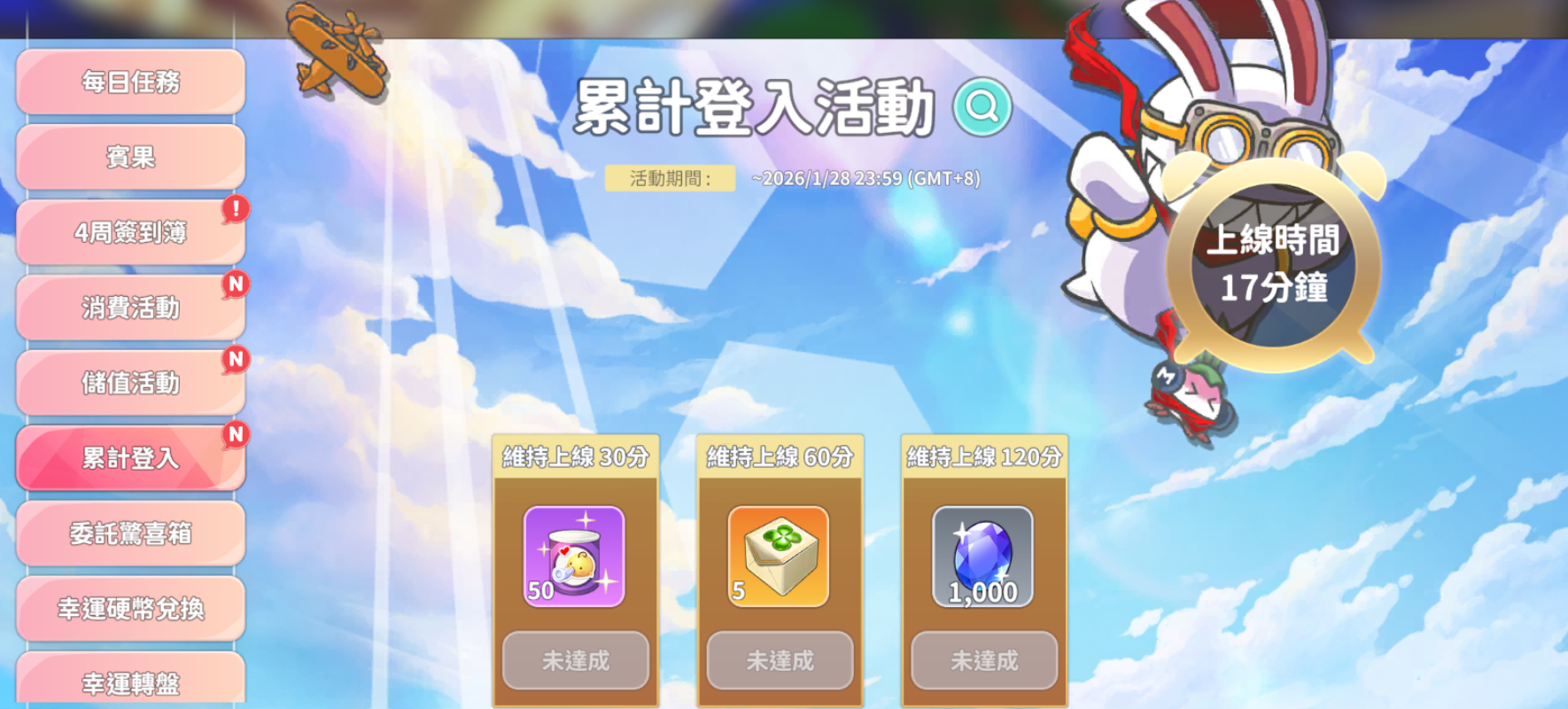 每天登入遊戲達到指定時間,即可領取累計登入的活動獎勵。