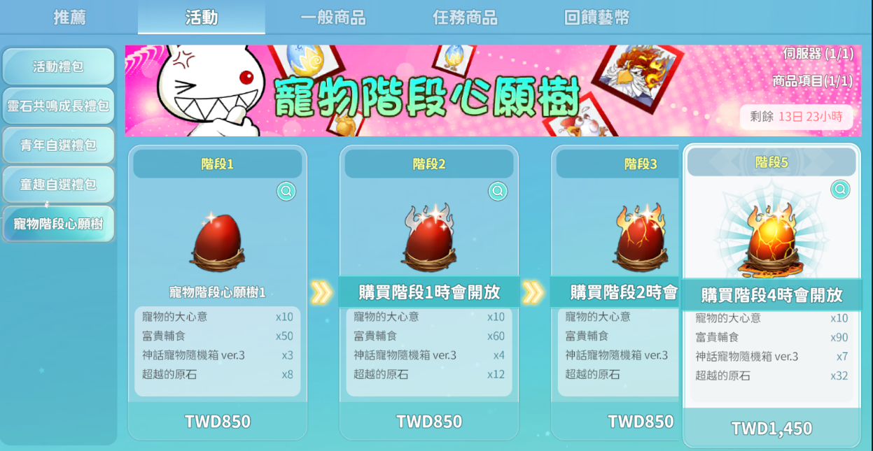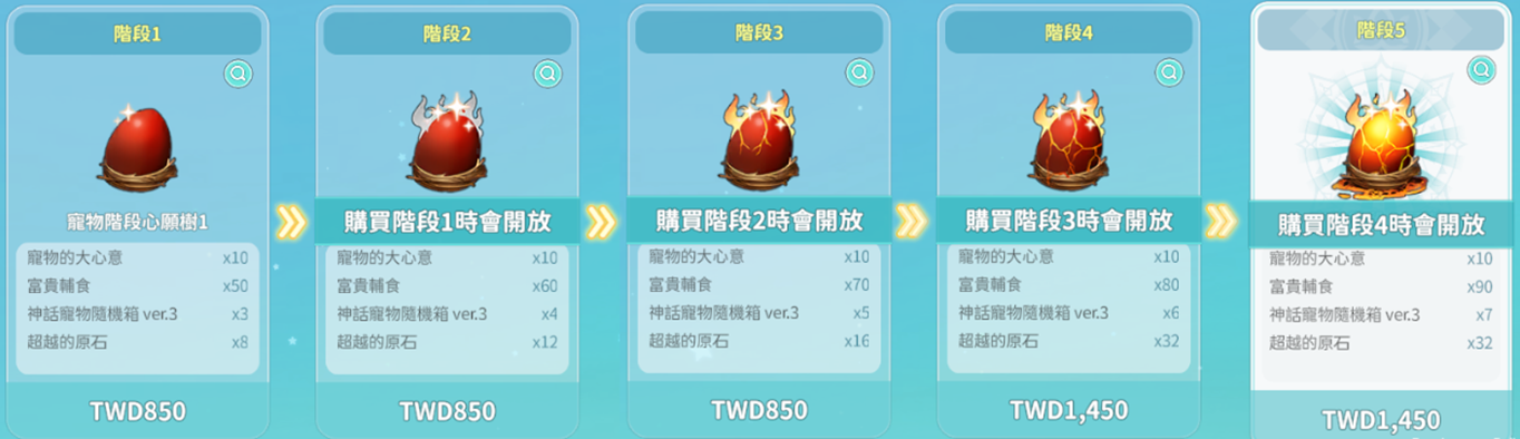 1. 寵物階段心願樹採階段式販售,購買下一階段商品前,須先完成前一階段商品之購買。