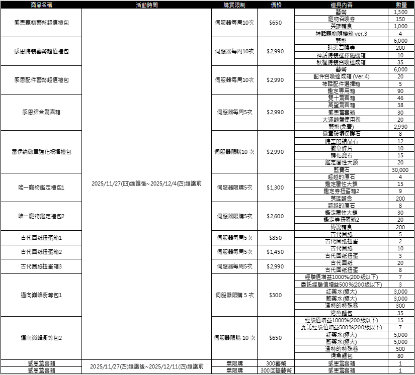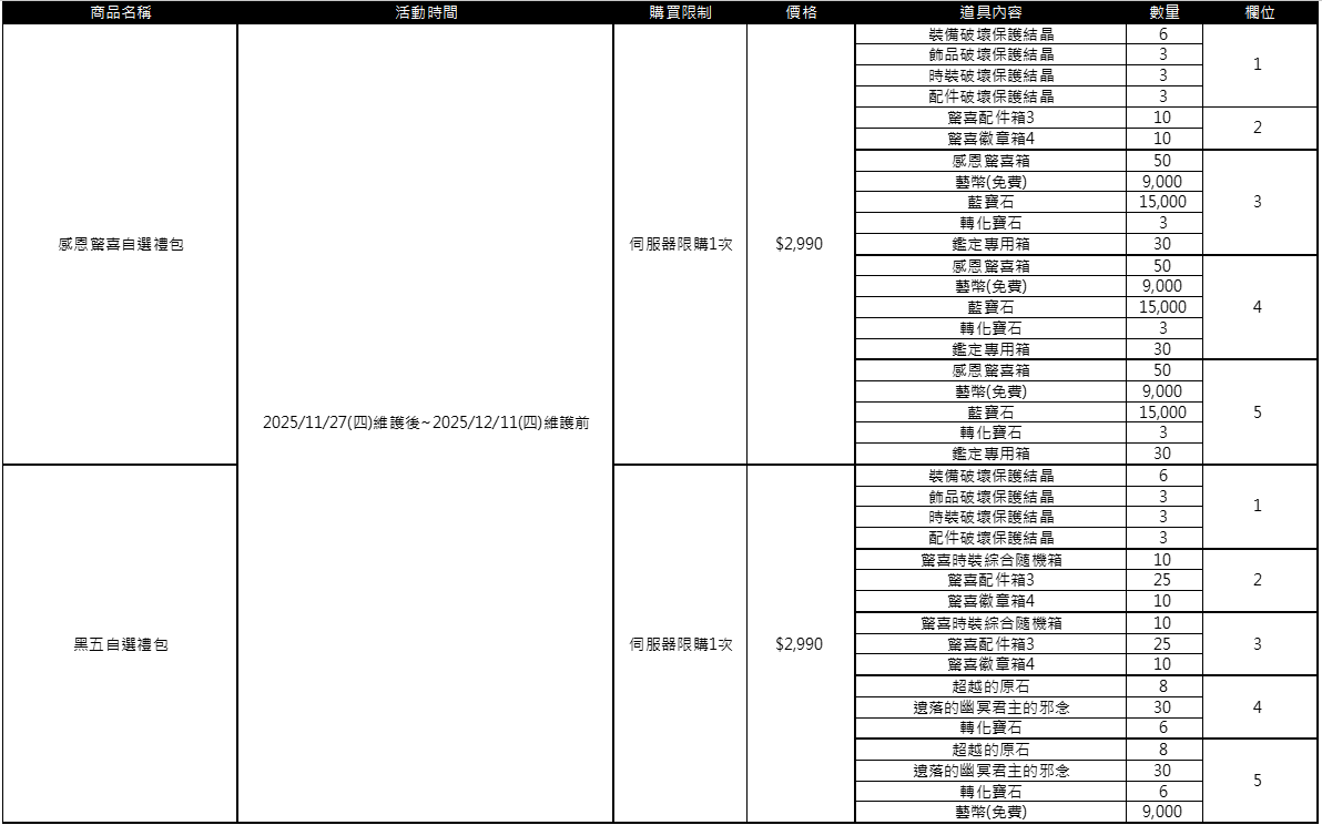 ■ 各禮包販售期限、售價及限購資訊:(點圖可放大)