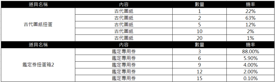 古代圖紙扭蛋、鑑定扭蛋券機率:
