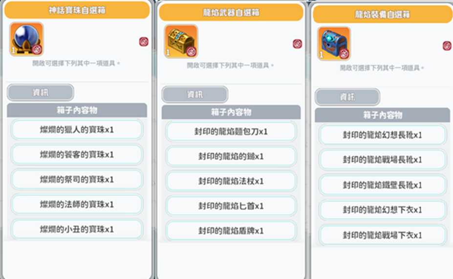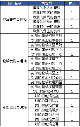神話寶珠、龍焰裝備、龍焰武器自選箱內容物: