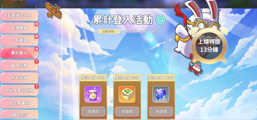 每天登入遊戲達到指定時間,即可領取累計登入的活動獎勵。