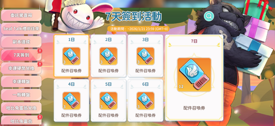 每日簽到可獲得遊戲內所需的道具。活動時間結束後沒有簽到的天數將不會另外補償。