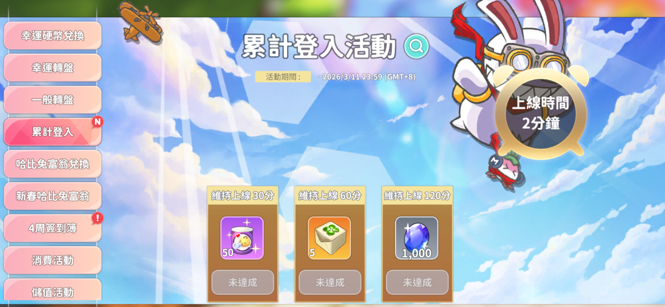 每天登入遊戲達到指定時間,即可領取累計登入的活動獎勵。