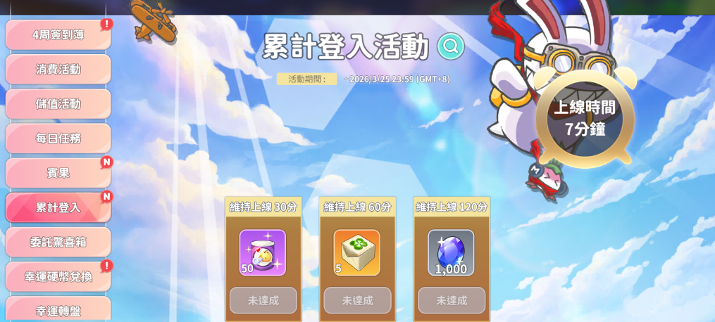 每日累計登入達指定時間,可獲得遊戲內所需的道具。