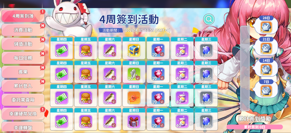 每日簽到可獲得遊戲內所需的道具。忘了簽到嗎?未簽到的日期可以使用貨幣來補領。