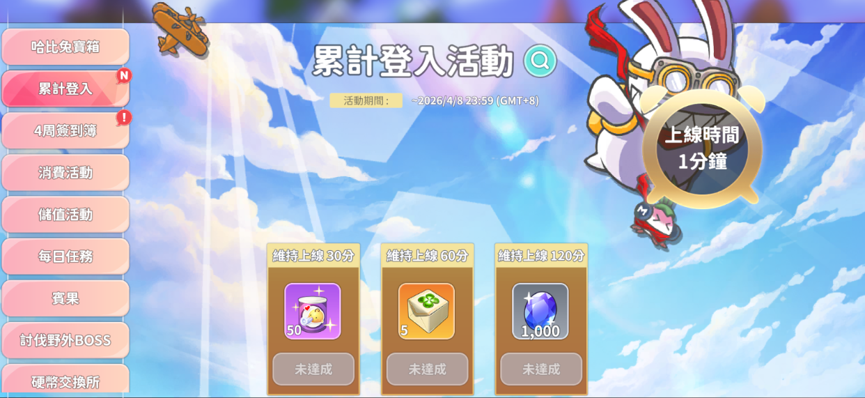 每天登入遊戲達到指定時間,即可領取累計登入的活動獎勵。