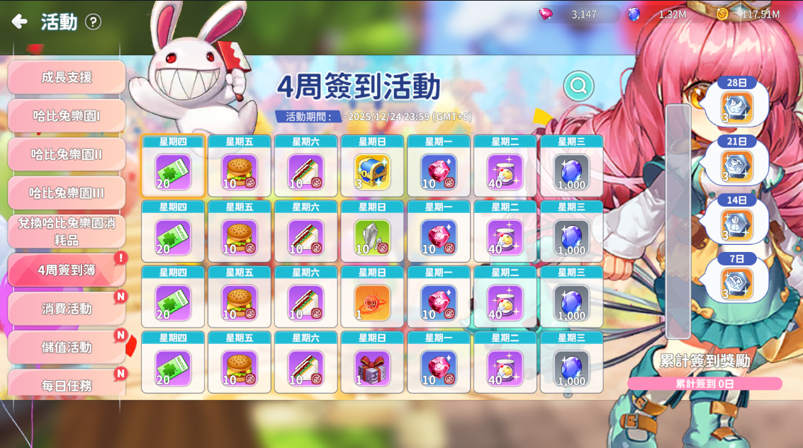 每天參加的話,簽到第7/14/21/28累計簽到送破壞保護結晶。