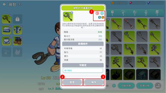 3. 佩戴中的裝備先點擊“解除”按鈕後解除裝備。若是可佩戴的裝備時,不會出現“解除”按鈕,會出現“裝備”按鈕。