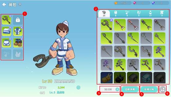 在遊戲內獲得的道具可在背包確認。開啟背包可以佩戴裝備或使用道具。