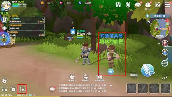 角色達到23級後可與NPC退休的船匠接取釣魚任務,使用左下方的按鈕可進行釣魚。