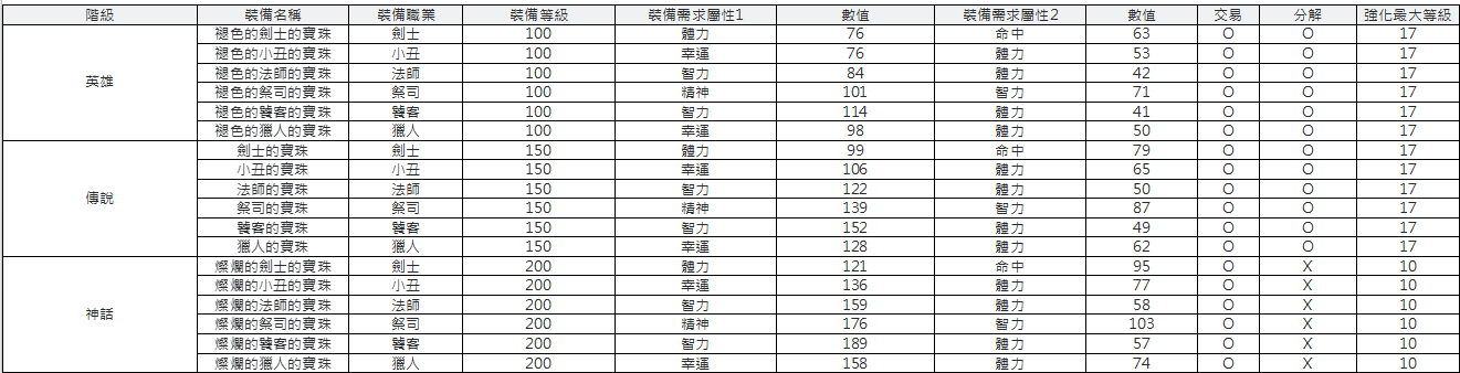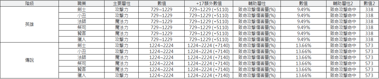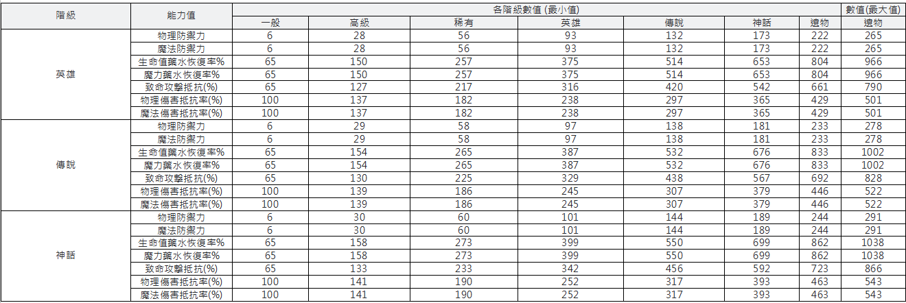 英雄/傳說階級輔助裝備數值如下: