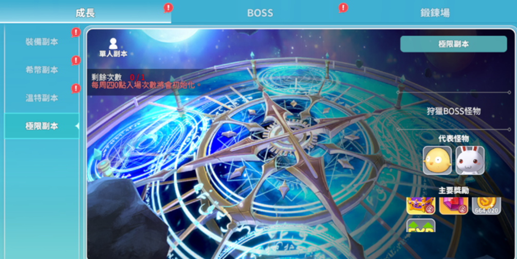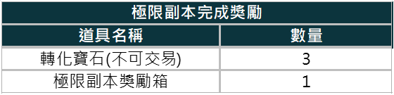 - 極限副本為單人副本,每周可入場一次,入場次數將於每週四0時重置。