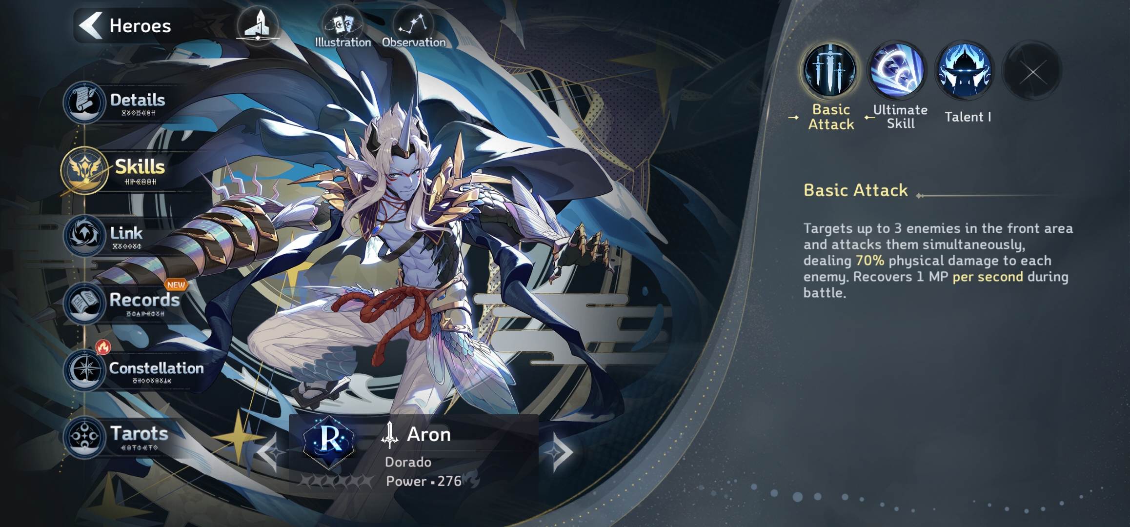 The Constellation screen allows you to use Awakening feature. Awakening enhances a hero's skills and attributes. Each time you awaken a hero, you can choose one hero among the three heroes of the higher class and receive shards as a reward. For SSR heroes, you receive three shards of the same SSR hero.