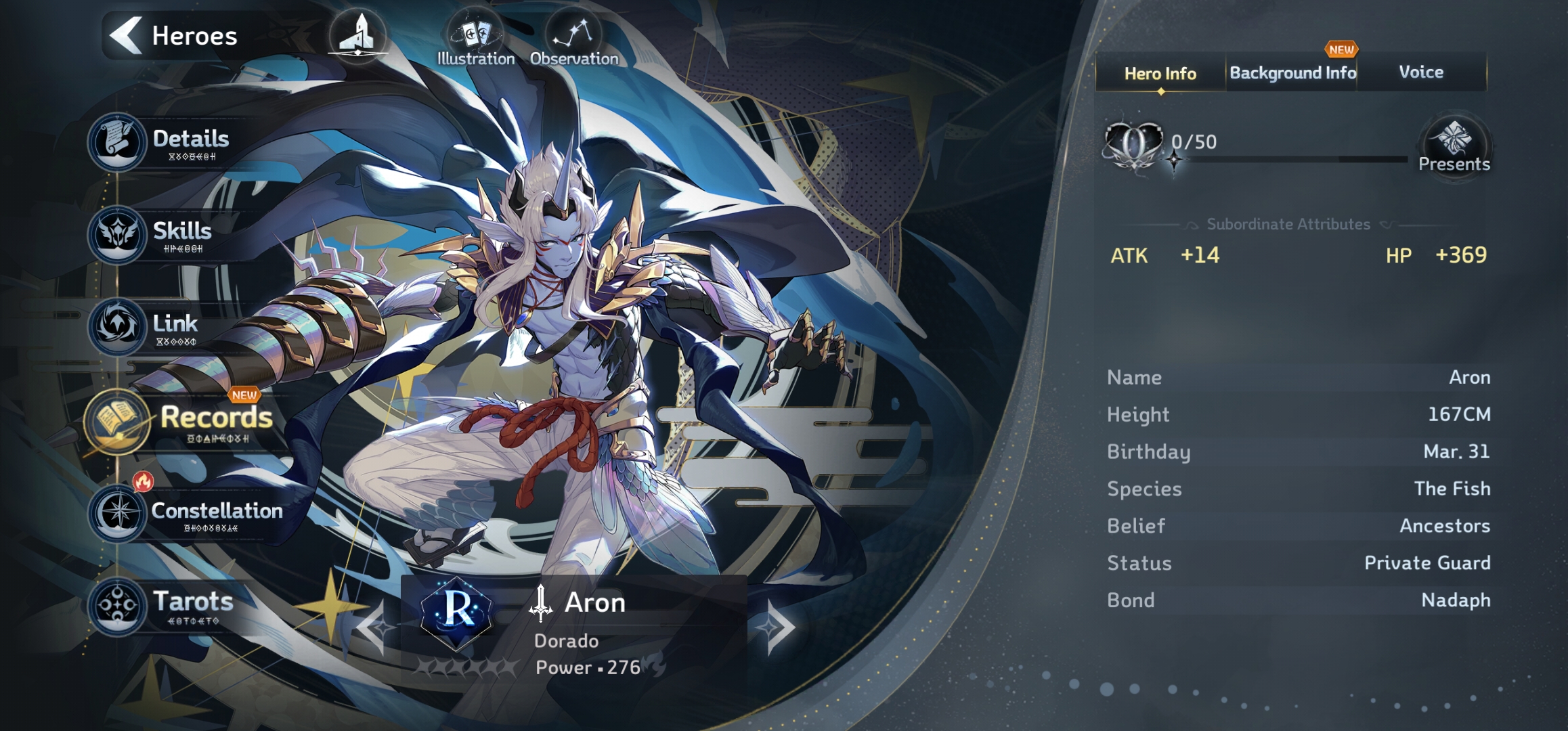 In Records, you can give presents to heroes to increase affinity. As affinity rises, the hero's attributes receive a partial boost, and unlocks the hero's background information. Every hero's affinity can reach a maximum level of 10.