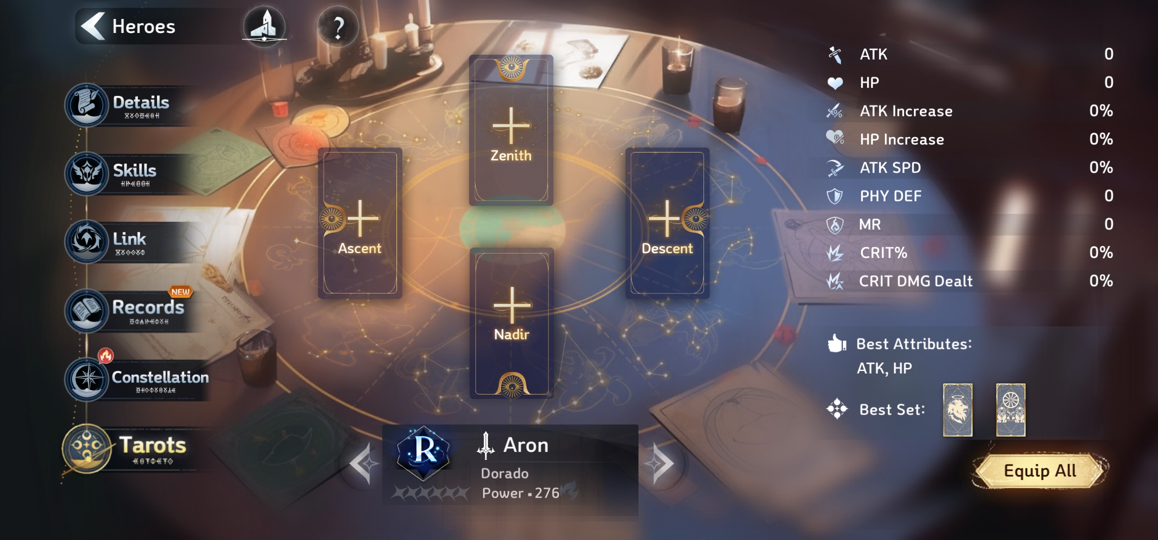 On the Tarots screen, you can equip and enhance the tarots. To activate a set effect, you must equip the same Tarots on all four parts: Zenith, Ascent, Nadir and Descent. The hero's attributes increase based on the type and level of the equipped Tarots.