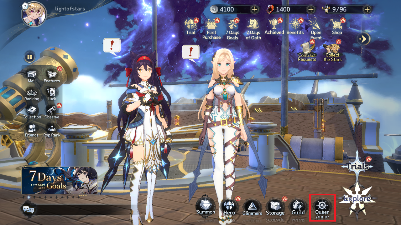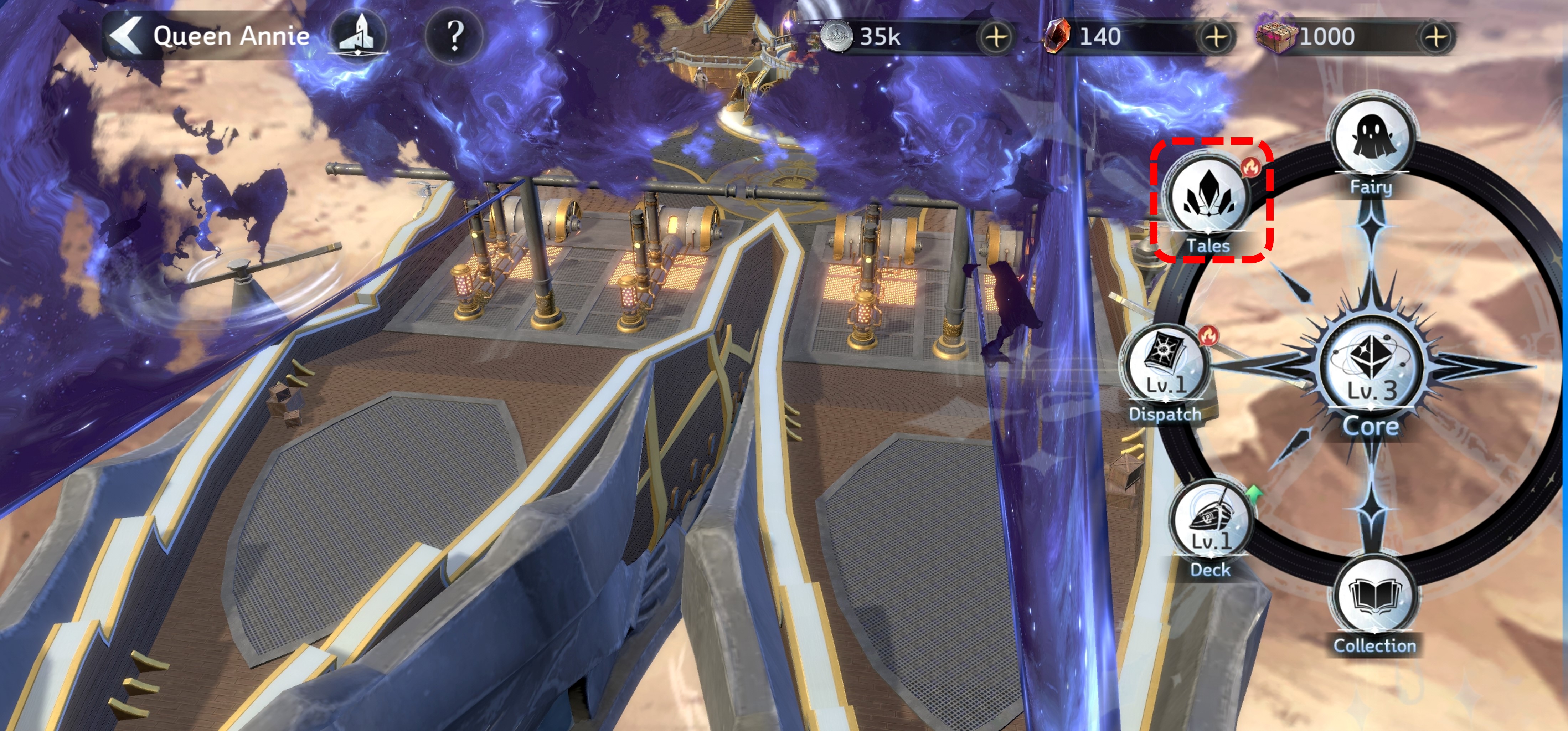 Tales become available when Queen Annie's core reaches level 3. Additionally, you can attempt a daily quiz related to one hero, solving two questions in a single attempt to receive 50 Dark Stone Crystals.