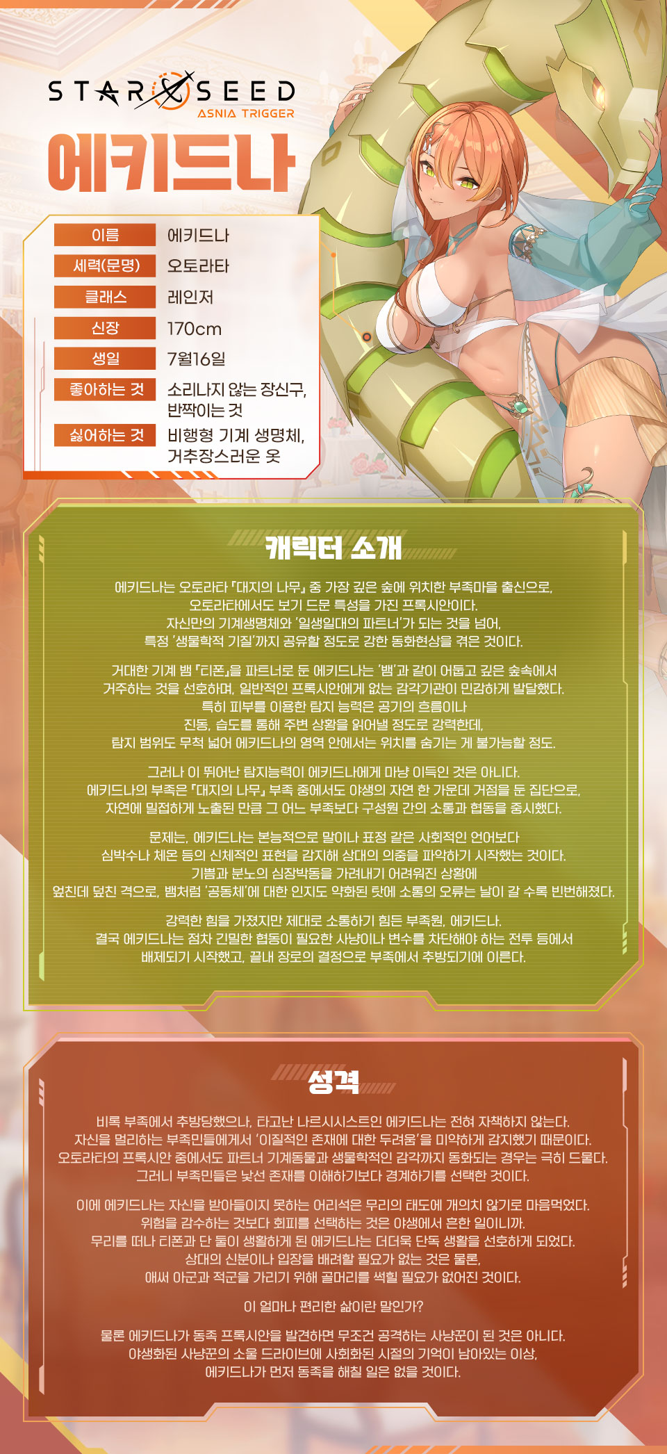 가장 깊은 숲에 위치한 부족 마을 출신인 에키드나에 대해 소개해드릴게요.