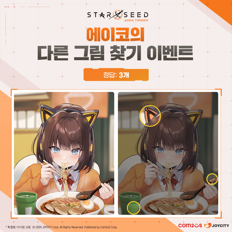 - 이벤트 기간 중 에이코의 생일을 맞이해 준비한 다른 그림 찾기 문제를 보고 다른 부분의 개수를 이벤트 공지사항 내 댓글로 작성해주시면 참여 완료!