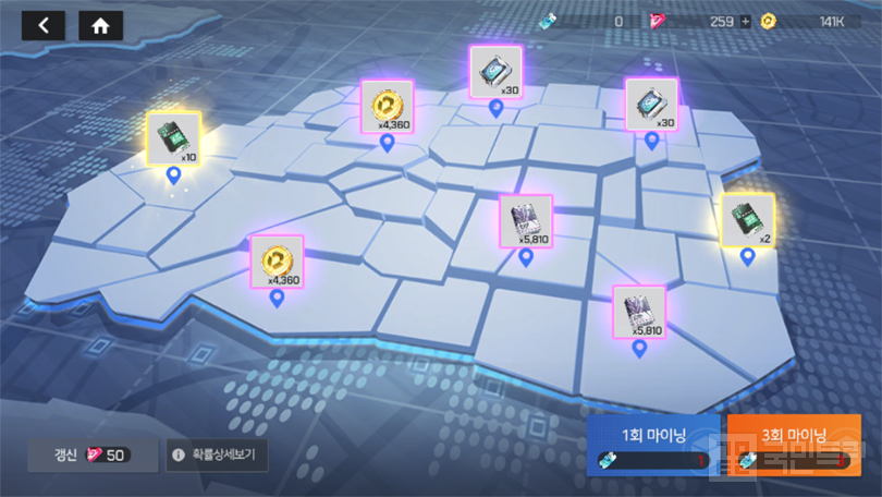 마이닝 코어는 마이닝 티켓을 소모해 주어진 확률에 따라 보상을 획득하는 콘텐츠다. 이때 보상 목록은 갱신을 통해 바꿀 수 있고, 한 번 획득한 상급 보상은 또 획득할 수 없다. 그러니 상급 보상을 획득하면 마이닝 목록을 한 번 무료 갱신하거나 혹은 다음 날을 기다리며 티켓을 아끼자.