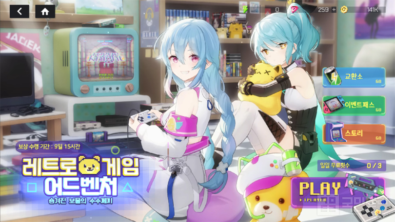 레트로 게임 어드벤처 이벤트는 4월 11일까지 진행하는 이벤트 콘텐츠다. 매일 3번의 무료 기회로 스테이지에 도전할 수 있고, 클리어 시 단계에 따라 크레딧, 한정판 게임기(호감도 선물), 게이밍 드링크를 손에 넣는다. 여기서 게이밍 드링크는 교환소에서 다양한 아이템과 교환하는 데 쓰인다.