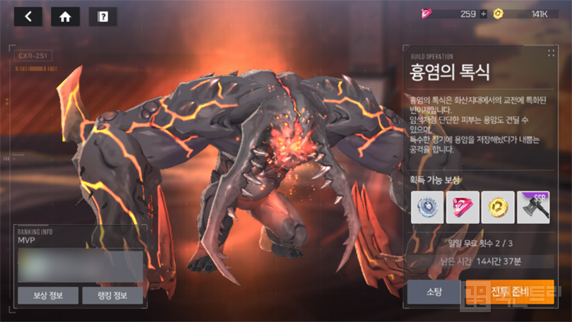 길드 작전은 주어진 시간 동안 길드 보스를 공략해 추가 보상을 획득하는 콘텐츠다. 매일 무료로 3번의 횟수가 주어지며, 3번의 기회에서 가장 높은 피해량을 측정해 길드원과 등수를 겨룰 수 있다. 또한, 가장 높은 피해량 기준의 소탕 기회가 있으니 더 이상 높은 피해량을 넣기 힘들 것 같다면 소탕을 통해 보상을 획득하자. 추가로 길드 작전은 다른 콘텐츠와 다르게 매일 오전 9시가 아닌 오전 8시 30분에 마감되니 그 전에 3번의 기회를 모두 소모하자.