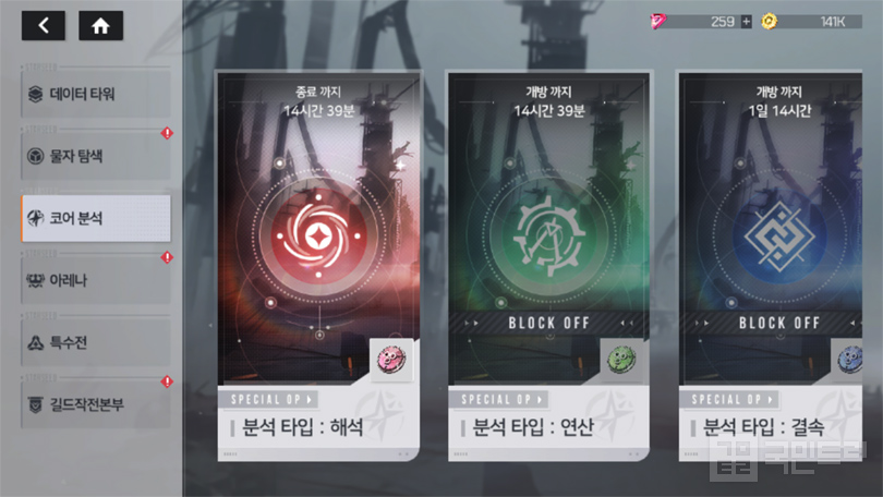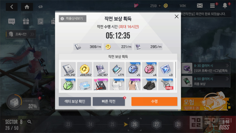 단, 작전 보상은 최대 16시간까지만 누적되기에 그 이전에는 반드시 수령해야 한다. 빠른 작전의 경우 매일 최대 5번까지 받을 수 있으니 모험 섹터를 최대한 공략하고, 이후 오전 9시에 초기화가 되기 전에 추가 획득하자.