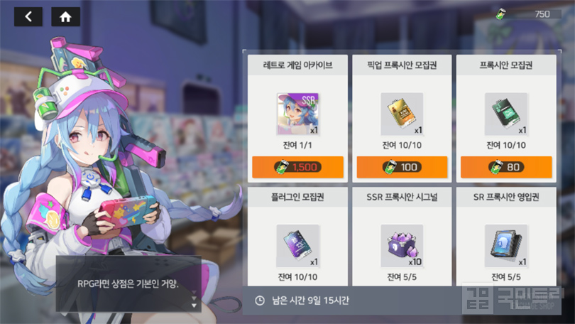이때 유리지아를 육성하는 유저라면 교환소 품목으로 레트로 게임 아카이브와 픽업 프록시안 모집권을 우선 교환해 유리지아의 승급 재료를 모으자. 다음으론 플러그인 모집권, 프록시안 모집권, SSR 프록시안 시그널 등을 추천한다. 매일 3번의 무료 기회를 써 보상을 챙기는 걸 잊지 말자.