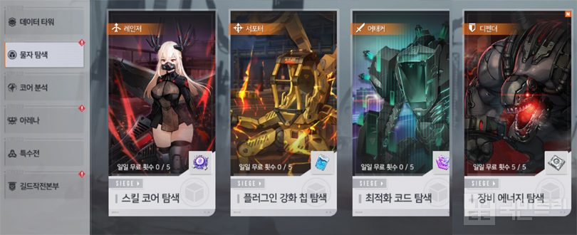 물자 탐색은 스킬 코어 탐색, 플러그인 강화 칩 탐색, 최적화 코드 탐색, 장비 에너지 탐색으로 총 5종류가 있다. 일일 무료 횟수는 액티베이션 센터 최고 강화 기준 총 5번이며, 각 요구조건을 채워 ★★★단계 보상을 획득하는 것이 좋다. 단, 단계마다 보스 몬스터의 능력치가 대폭 증가하니 공략이 힘들 것 같다면 이전 단계 소탕을 통해 재화를 획득하자.