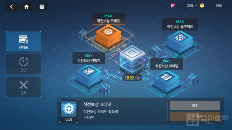우선 콘텐츠를 플레이하기에 앞서 엑티베이션 센터에서 성장 콘텐츠 재화의 양과 무료 플레이 횟수 증가를 업그레이드하자. 액티베이션 센터는 지난 업데이트 이후 업그레이드를 위한 자원 수량이 대폭 줄었다. 그러니 모든 분야를 최대 레벨로 높이는 것이 좋으니 반드시 확인하자. 특히, 이 가운데 전리품 – 작전보상 크레딧, 돌파재료, 경험치, 아이템의 경우 앞서 언급했던 작전 보상의 수량이 대폭 증가한다. 작전 보상을 수령하기 전에 업그레이드부터 진행하는 걸 추천한다.