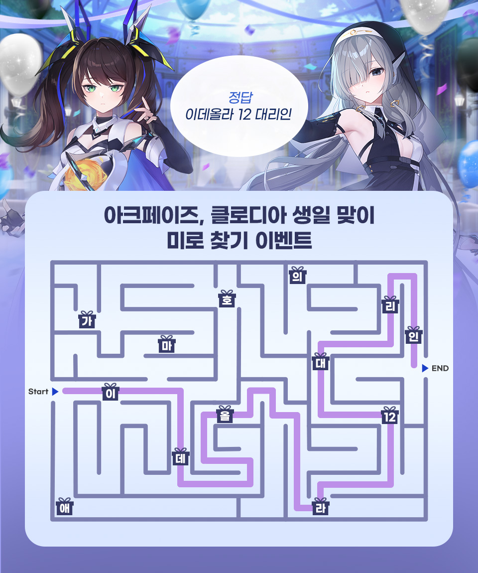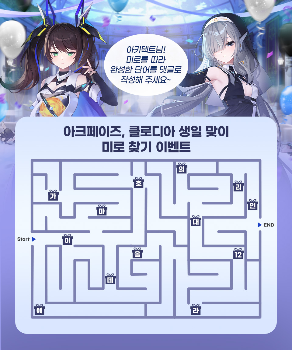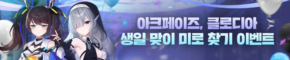 - 아크페이즈와 클로디아의 생일을 맞이해 준비한 생일 축하 미로 퀴즈를 풀고 정답 문구를 댓글로 남겨주시면 참여 완료!