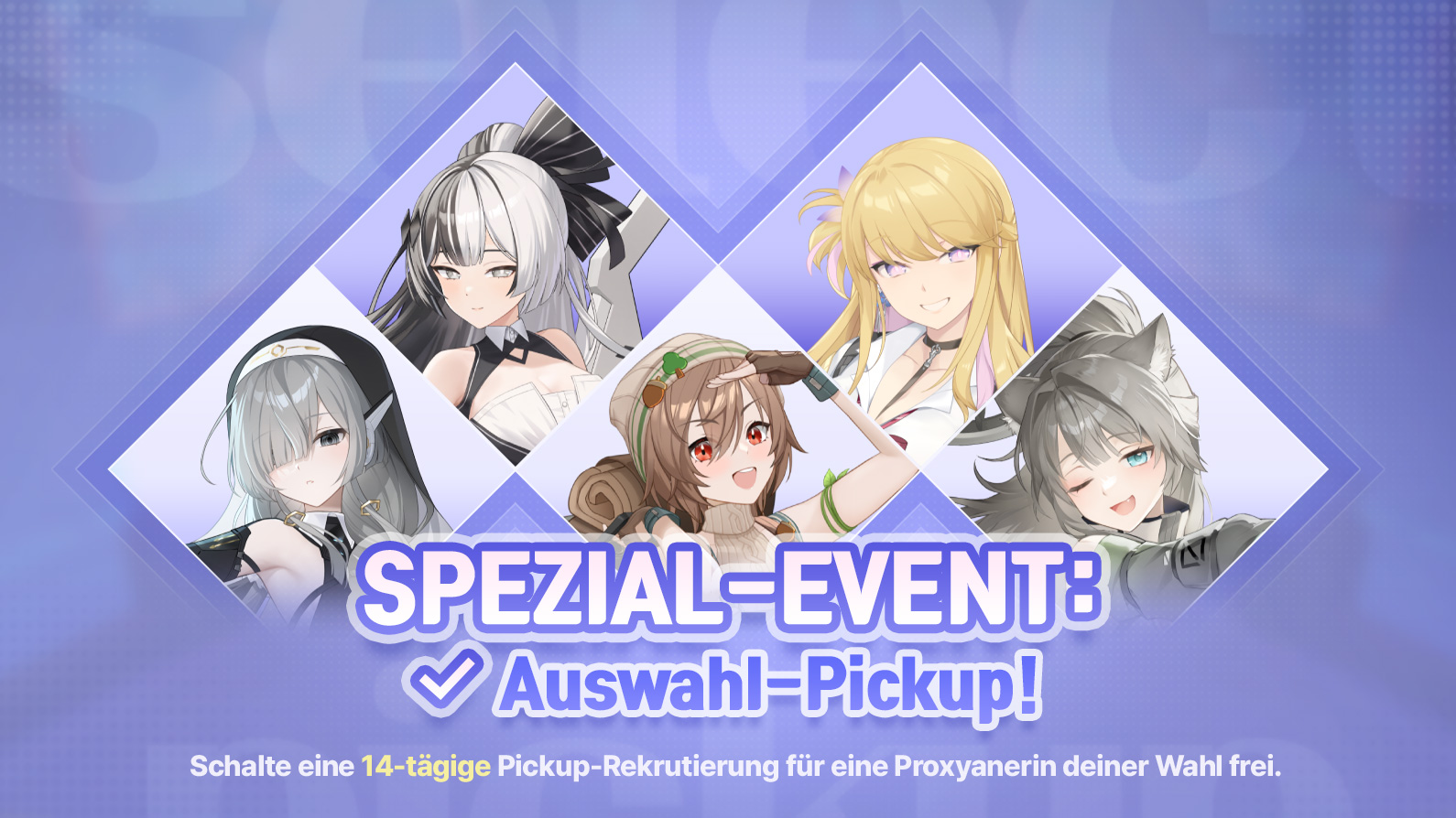 Nimm am [Spezial-Event: Auswahl-Pickup] teil! Wähle deine gewünschte Pickup-Proxyanerin und rekrutiere sie mit einer höheren Wahrscheinlichkeit!