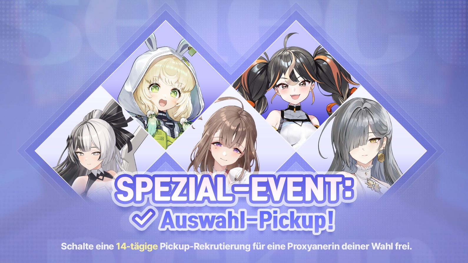 - Während des Event-Zeitraums kannst du eine von Fünf Proxyanerinnen für die Pickup-Rekrutierung auswählen. Die exklusive Pickup-Rekrutierung für die gewählte Proxyanerin ist 14 Tage lang verfügbar.