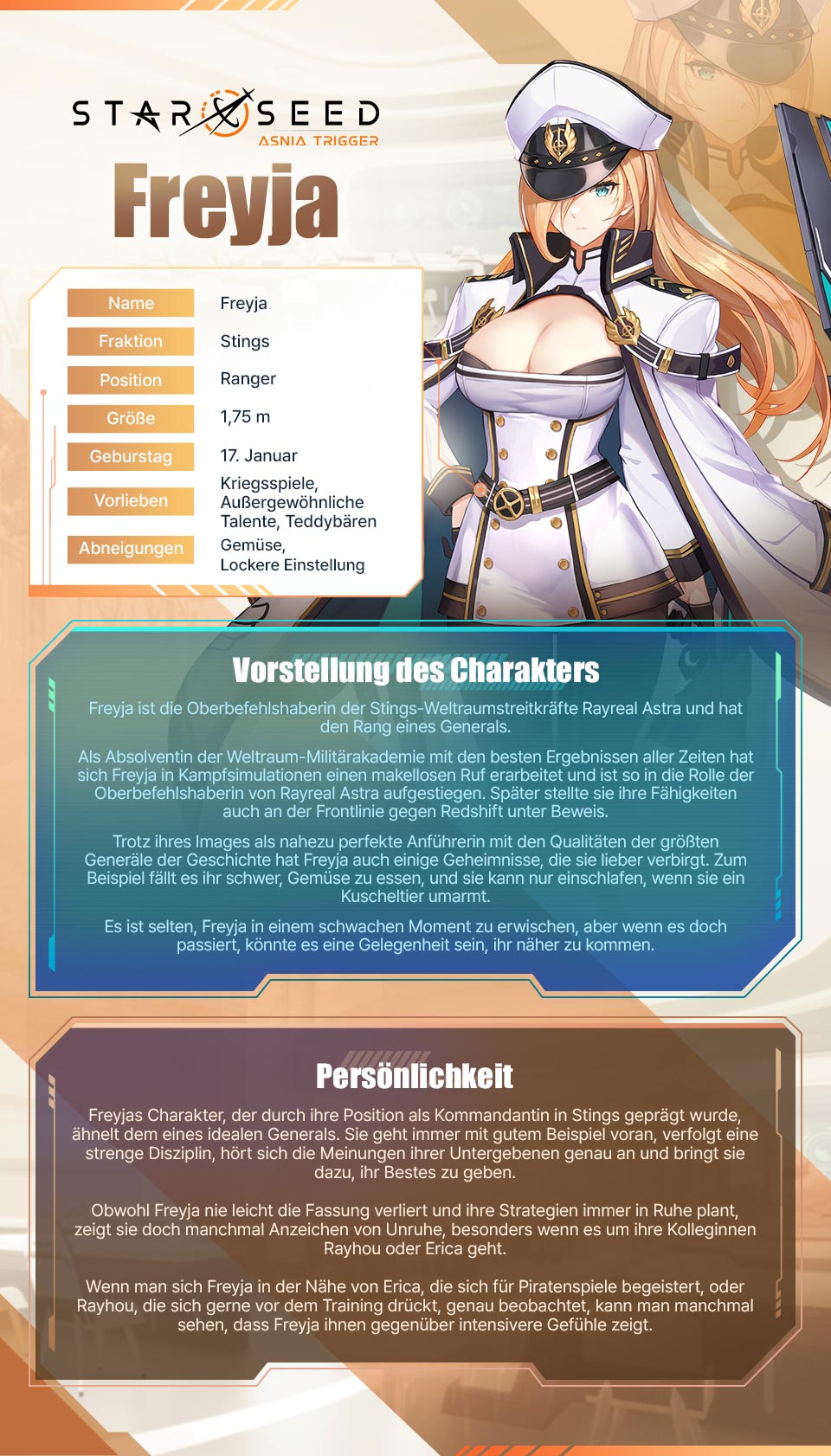 Als Jahrgangsbeste der Militärakademie in Stings hat Freyja sich mit einer makellosen Bilanz in Scheinkämpfen ein Denkmal gesetzt und ist schließlich in den Rang eines Admirals aufgestiegen.