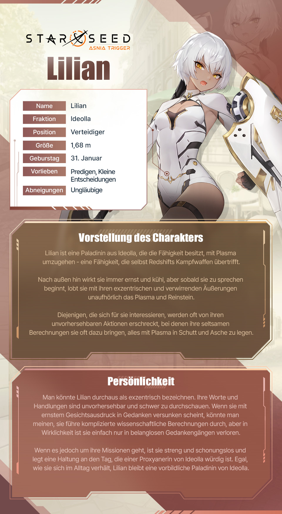 Lilian ist eine strenge und kompromisslose Proxyanerin, wenn sie ihre Missionen ausführt, aber sobald sie anfängt zu reden, macht sie immer wieder die exzentrischsten Bemerkungen.