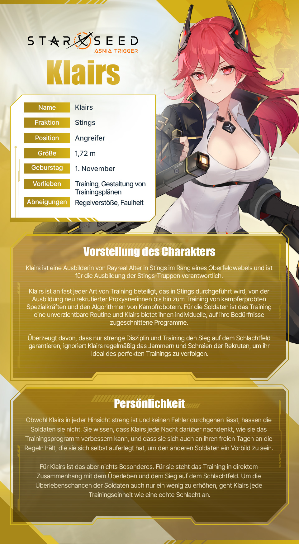 Klairs nimmt als Ausbilderin aktiv an den verschiedenen Trainings teil und bemüht sich, mit gutem Beispiel voranzugehen, was ihr den Respekt ihrer Soldatinnen einbringt.
