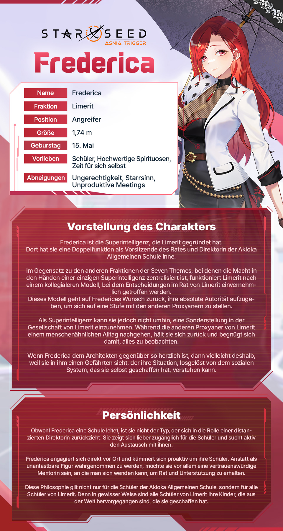 Frederica ist sowohl die Direktorin der Akioka Allgemeinen Schule als auch die Vorsitzende des Rates von Limerit.
