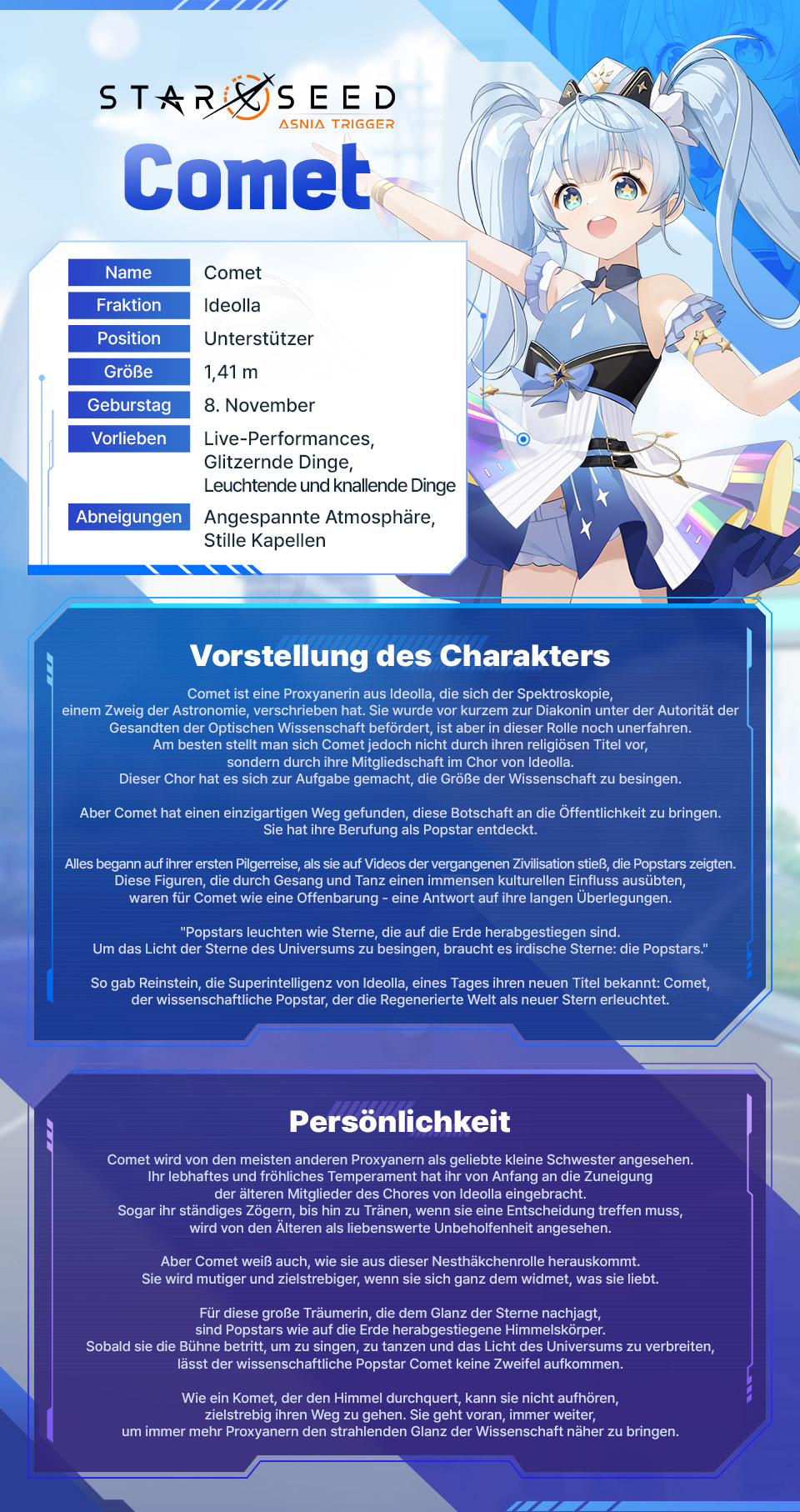 Nachdem Comet von der Pop-Kultur der vergangenen Zivilisation erfahren hatte, beschloss sie, selbst ein Popstar zu werden, um die Wunder der Wissenschaft zu verbreiten.